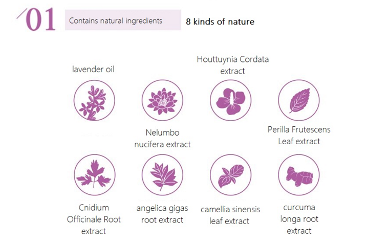 Purified water, glycerin, disodium EDTA, citric acid, Nelumbo nucifera extract, Houttuynia Cordata extract, Perilla Frutescens Leaf extract, Cnidium Officinale Root extract, angelica gigas root extract, camellia sinensis leaf extract, curcuma longa root extract, polyglutamic acid, polysorbate 20, tocopheryl acetate, lavender oil, ethylhexyl glycerin, cetylpyridinium chloride, caprylyl glycol, cocamidopropyl PG-dimonium chloride phosphate, benzalkonium chloride, lactic acid, Linaloo